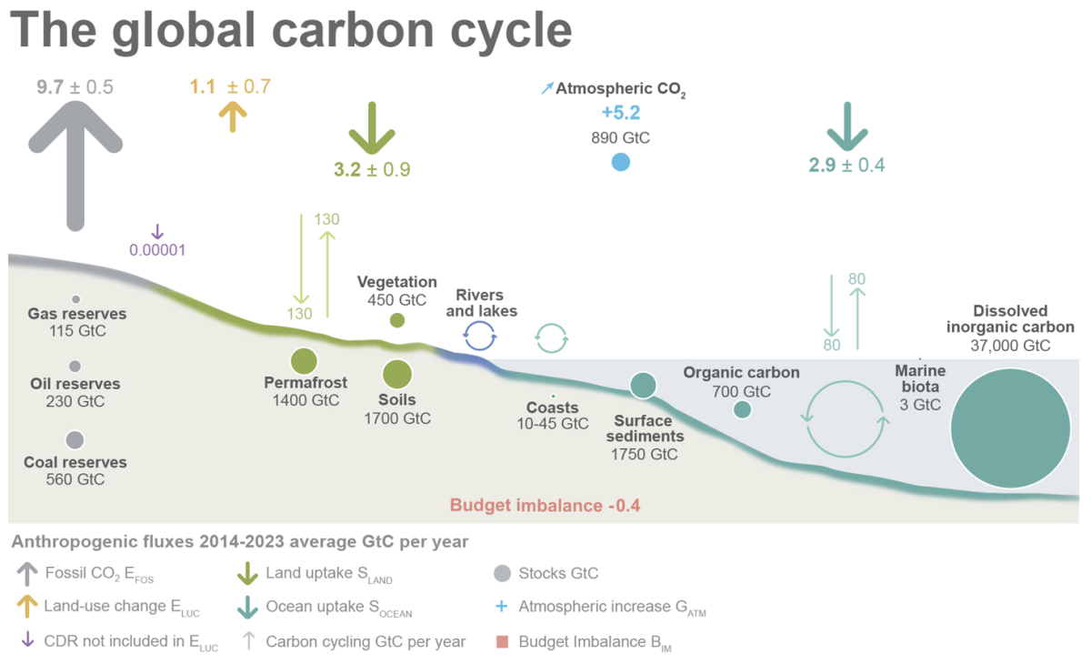 Friedlingstein, P., O'Sullivan, M., Jones, M. W., Andrew, R. M., Hauck, J., Landschützer, P., Le Quéré, C., Li, H., Luijkx, I. T., Olsen, A., Peters, G. P., Peters, W., Pongratz, J., Schwingshackl, C., Sitch, S., Canadell, J. G., Ciais, P., Jackson, R. B., Alin, S. R., Arneth, A., Arora, V., Bates, N. R., Becker, M., Bellouin, N., Berghoff, C. F., Bittig, H. C., Bopp, L., Cadule, P., Campbell, K., Chamberlain, M. A., Chandra, N., Chevallier, F., Chini, L. P., Colligan, T., Decayeux, J., Djeutchouang, L., Dou, X., Duran Rojas, C., Enyo, K., Evans, W., Fay, A., Feely, R. A., Ford, D. J., Foster, A., Gasser, T., Gehlen, M., Gkritzalis, T., Grassi, G., Gregor, L., Gruber, N., Gürses, Ö., Harris, I., Hefner, M., Heinke, J., Hurtt, G. C., Iida, Y., Ilyina, T., Jacobson, A. R., Jain, A., Jarníková, T., Jersild, A., Jiang, F., Jin, Z., Kato, E., Keeling, R. F., Klein Goldewijk, K., Knauer, J., Korsbakken, J. I., Lauvset, S. K., Lefèvre, N., Liu, Z., Liu, J., Ma, L., Maksyutov, S., Marland, G., Mayot, N., McGuire, P., Metzl, N., Monacci, N. M., Morgan, E. J., Nakaoka, S.-I., Neill, C., Niwa, Y., Nützel, T., Olivier, L., Ono, T., Palmer, P. I., Pierrot, D., Qin, Z., Resplandy, L., Roobaert, A., Rosan, T. M., Rödenbeck, C., Schwinger, J., Smallman, T. L., Smith, S., Sospedra-Alfonso, R., Steinhoff, T., Sun, Q., Sutton, A. J., Séférian, R., Takao, S., Tatebe, H., Tian, H., Tilbrook, B., Torres, O., Tourigny, E., Tsujino, H., Tubiello, F., van der Werf, G., Wanninkhof, R., Wang, X., Yang, D., Yang, X., Yu, Z., Yuan, W., Yue, X., Zaehle, S., Zeng, N., and Zeng, J.: Global Carbon Budget 2024, Earth Syst. Sci. Data Discuss. [preprint], https://doi.org/10.5194/essd-2024-519, in review, 2024.